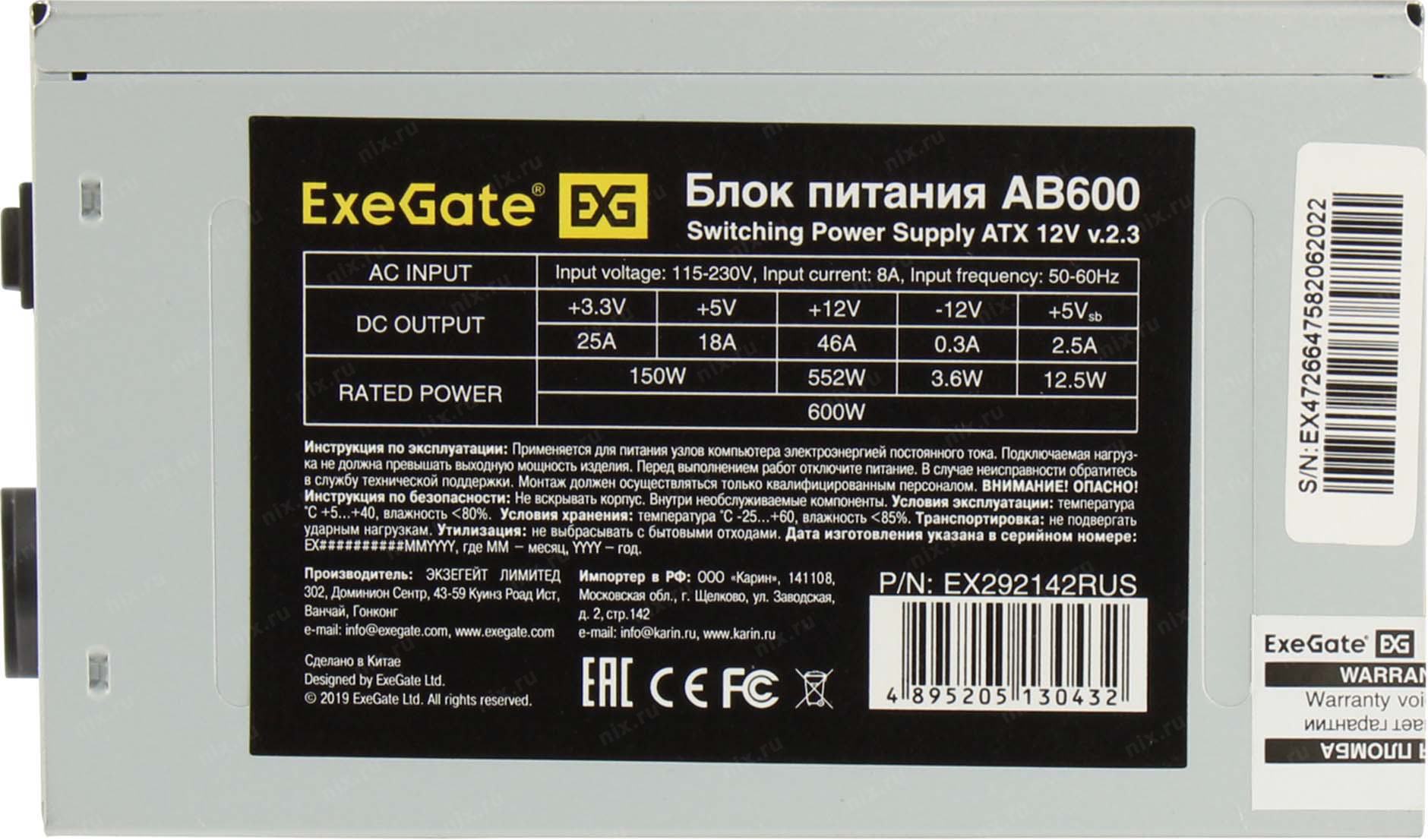 Блок питания Exegate EX292142RUS Блок питания 600W ExeGate AB600 (ATX, 8cm fan, 24pin, 4pin, 3xSATA, 2xIDE, FDD)