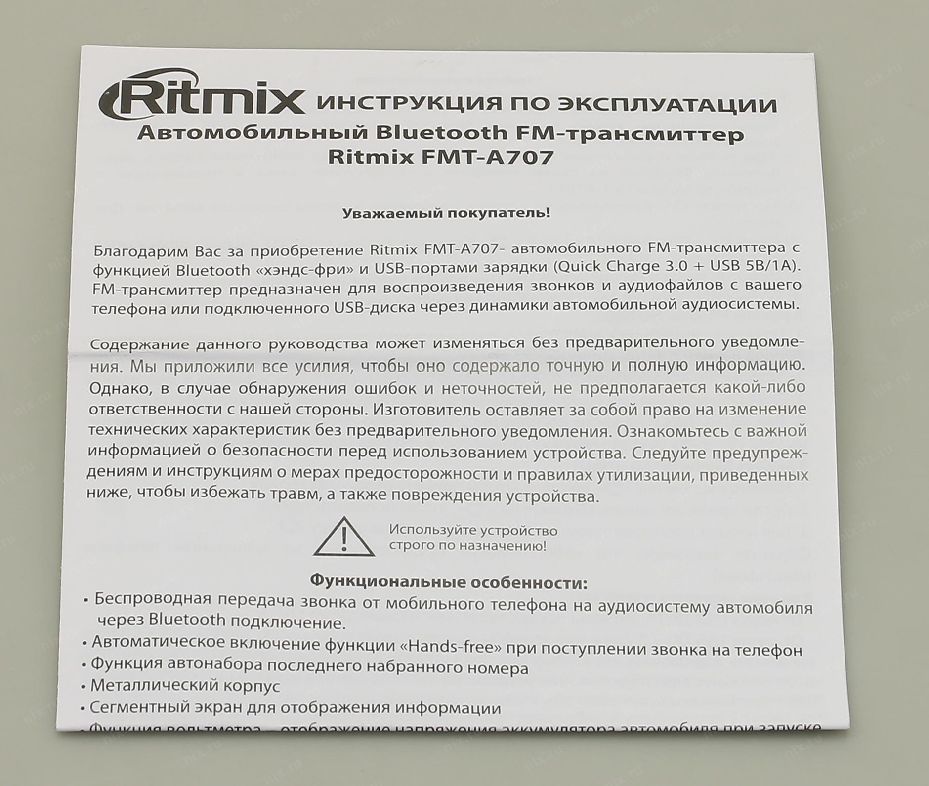 Многофункциональное устройство, которое сочетает в себе возможности FM-трансмиттера + автомобильного MP3-плеера, способного воспроизводить музыку с USB-порта + автомобильного зарядного устройства USB - один из портов поддерживает быструю зарядку QC3.0. Также поддерживается Bluetooth для изпользования в качестве гарнитуры или прослушивания музыки по Bluetooth
