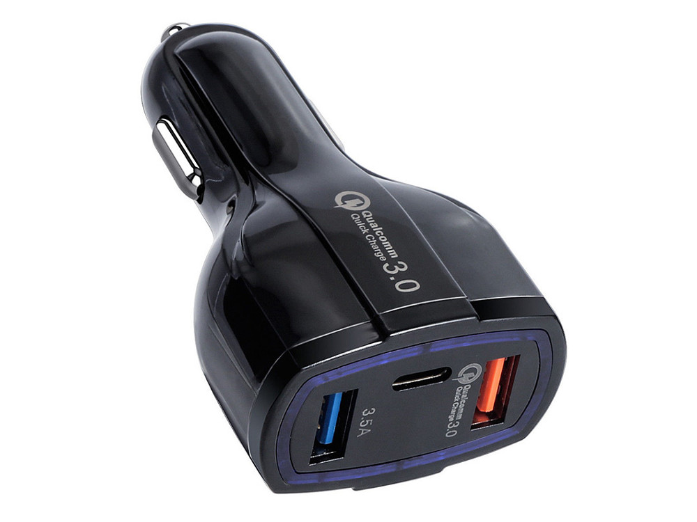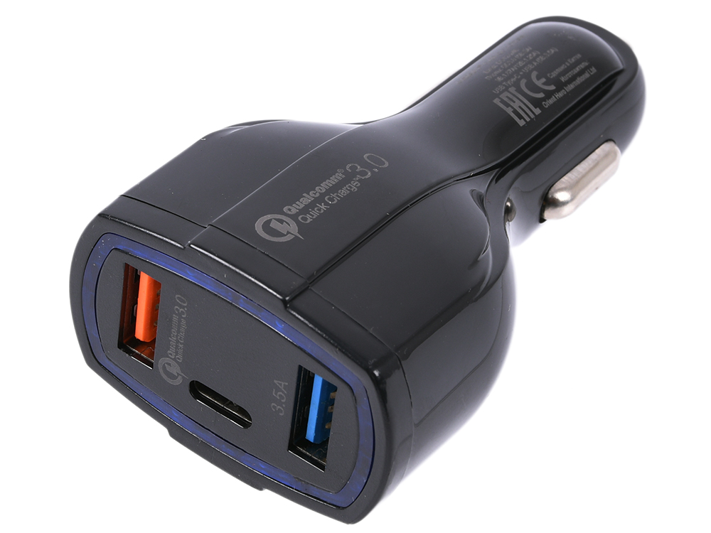 Универсальный автомобильный адаптер с двумя портами USB, одним портом USB Type C и поддержкой функции быстрой зарядки Qualcomm Quick Charge 3.0 для мобильных устройств (максимальная мощность 18 Вт). Адаптер позволяет осуществлять питание трёх устройств одновременно от "прикуривателя". Подходит для зарядки планшетов, мобильных телефонов, смартфонов, а также любых других устройств с возможностью зарядки по USB (5 В / до 3.5 А), а также от порта USB Type C (5 В)