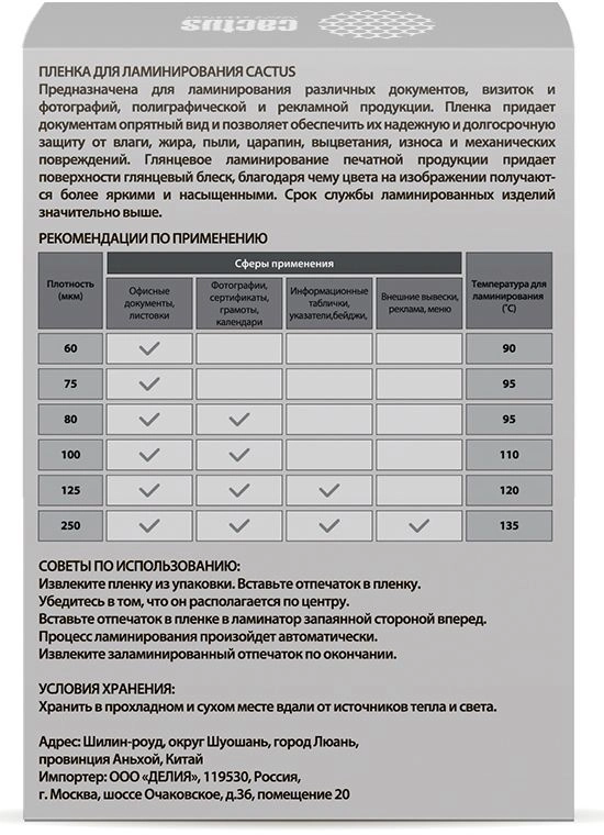 CACTUS плёнка для ламинирования Cactus Пленка для ламинирования 125мкм A7 (100шт) глянцевая 75 x 105мм [CS-LPGA7125100]