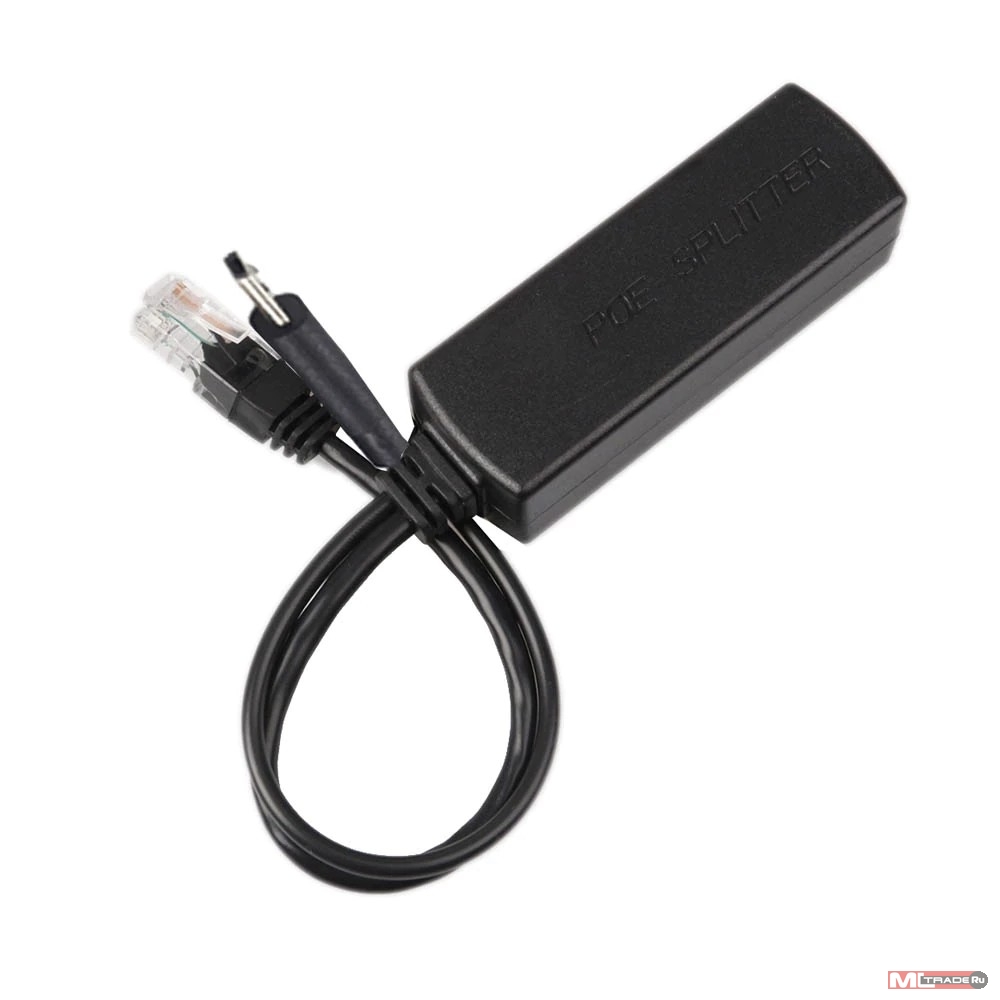 PoE сплиттер для приема питания по витой паре и передаче к сетевому оборудованию. Выходное напряжение 5В, напряжение на входе 48В. Коннектор micro-USB Bm
