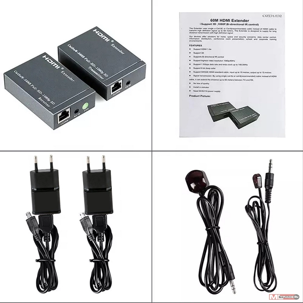Удлинитель предназначен для передачи сигналов высокой четкости на большие расстояния. Комплект состоит из передающего (Tx) и принимающего (Rx) блоков, обеспечивает передачу сигналов HDMI на по одному кабелю CAT5e/6, поддерживает высокое разрешение до 1920x1080@60Hz, петлевой выход HDMI и передачу ИК-сигнала.