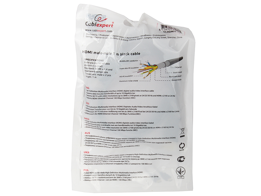 Кабель HDMI Cablexpert CC-HDMI4-1M, 19M/19M, v2.0, медь, позол.разъемы, экран, 1м, черный, пакет