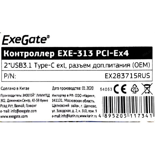 USВ-концентраторы Exegate EX283715RUS Контроллер EXE-313 PCI-Ex4, 2*USB3.1 Type-C ext, разъем доп.питания (OEM)