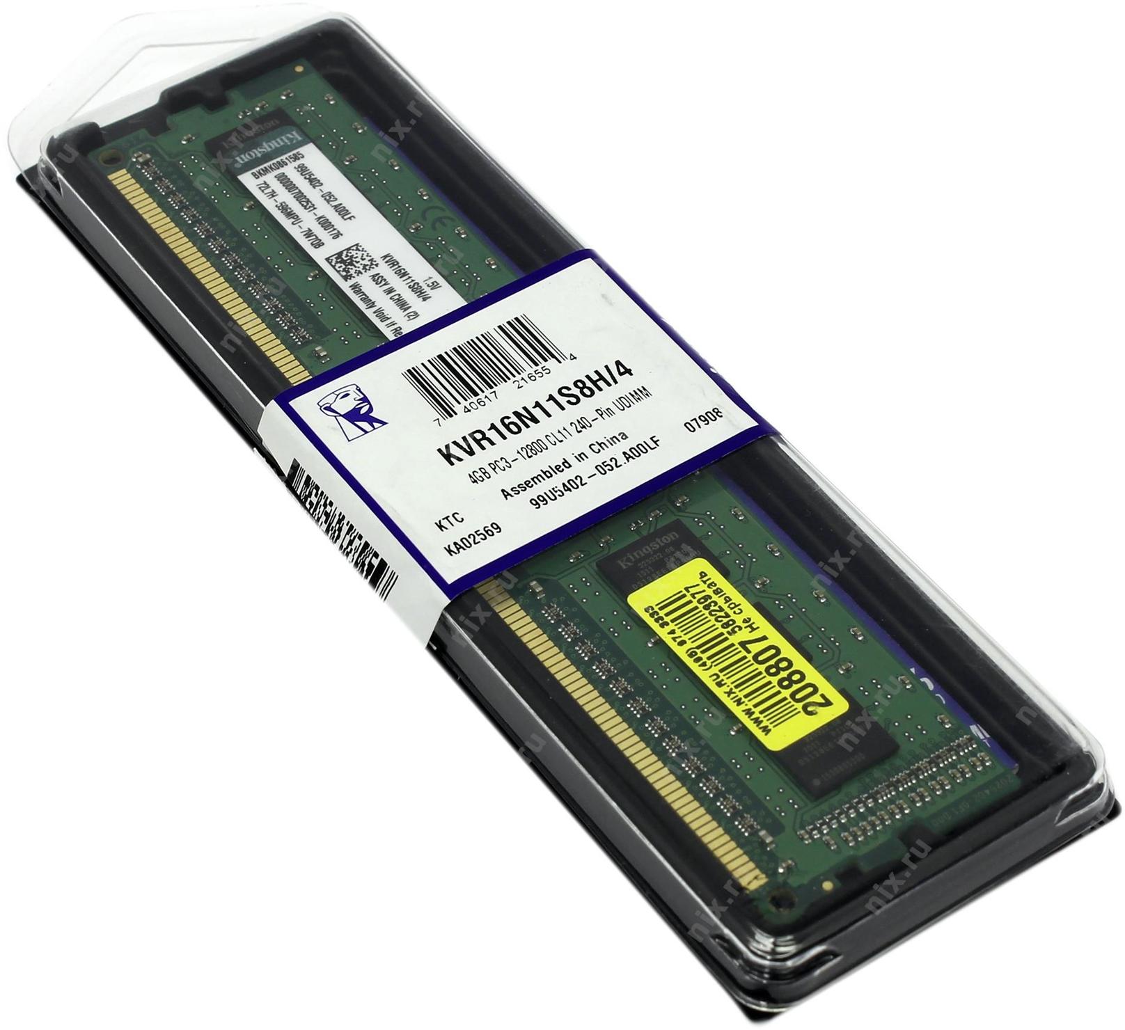 Память DDR3 4Gb 1600MHz Kingston KVR16N11S8/4WP VALUERAM RTL PC3-12800 CL11 DIMM 240-pin 1.5В Низкопрофильная single rank Ret