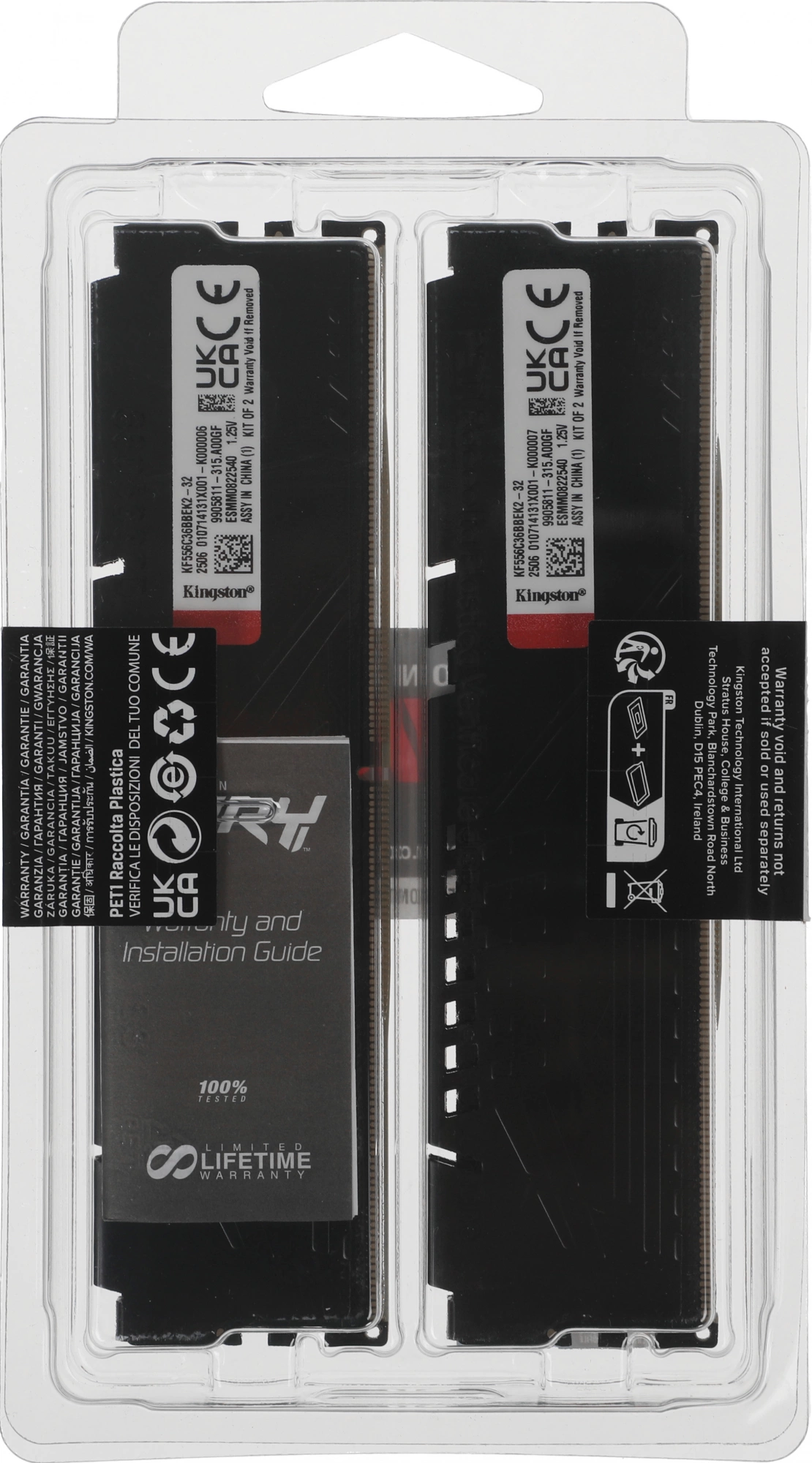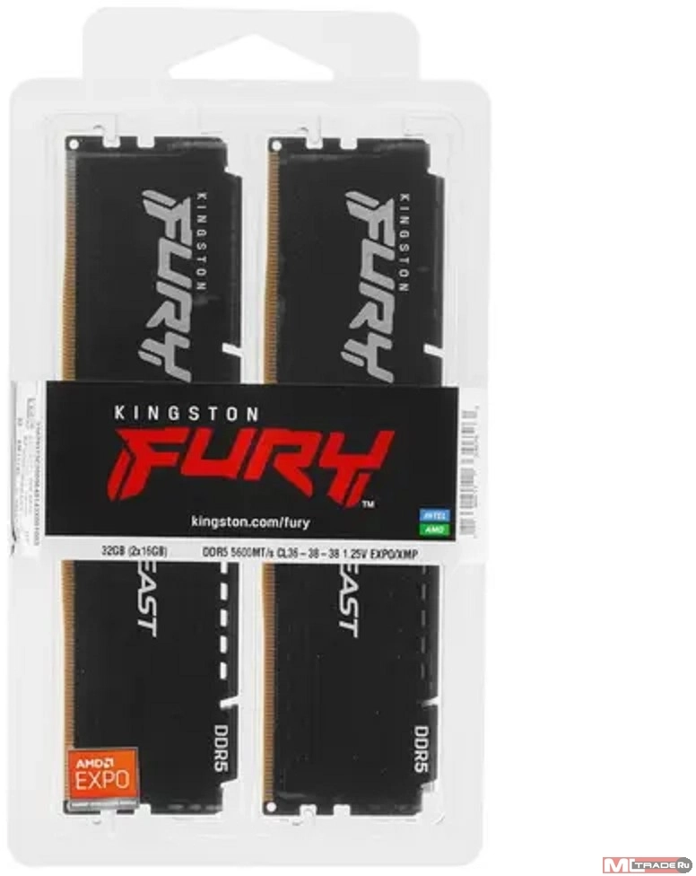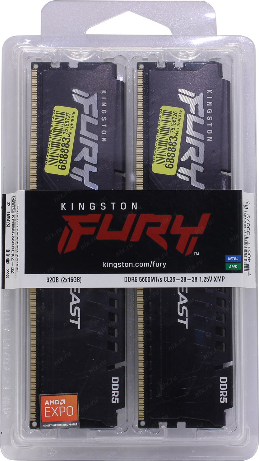 Модуль памяти Kingston 32GB DDR5 5600 FURY Beast Black EXPO Non-ECC Unbuffered DIMM (Kit 2*16gb) 1RX8 36-38-38 1.25V 288-pin 16Gbit (KF556C36BBEK2-32)