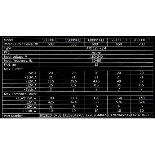 +3.3V - 21A, +5V - 20A, +12V - 35.5A, +5VSB - 2A, -12V - 0.5A;;; Комбинированная нагрузка: +3.3V & +5V - 100 Вт, +12V - 426 Вт