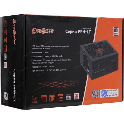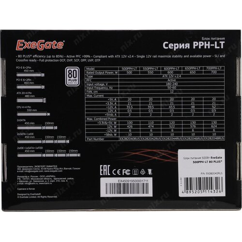 Блок питания Exegate EX282040RUS Блок питания 500W Exegate 500PPH-LT, 80+,RTL ATX, black, APFC, 12cm, 24p, (4+4)p, 5*SATA, 3*IDE