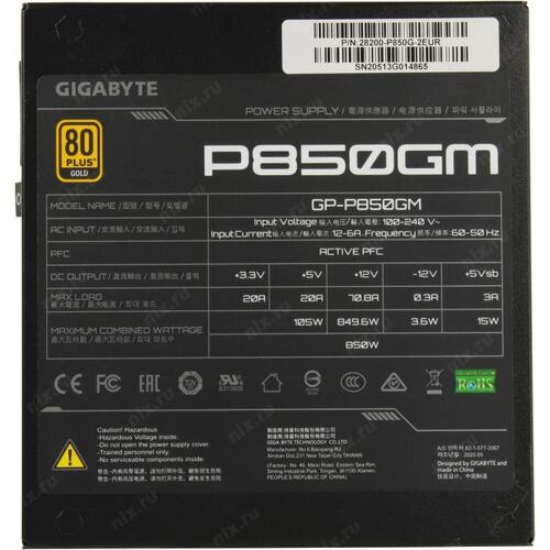 Блок питания Gigabyte P850GM GP-P850GM 850W, 80 Plus, Gold, Полностью модульный, RTL (551865)