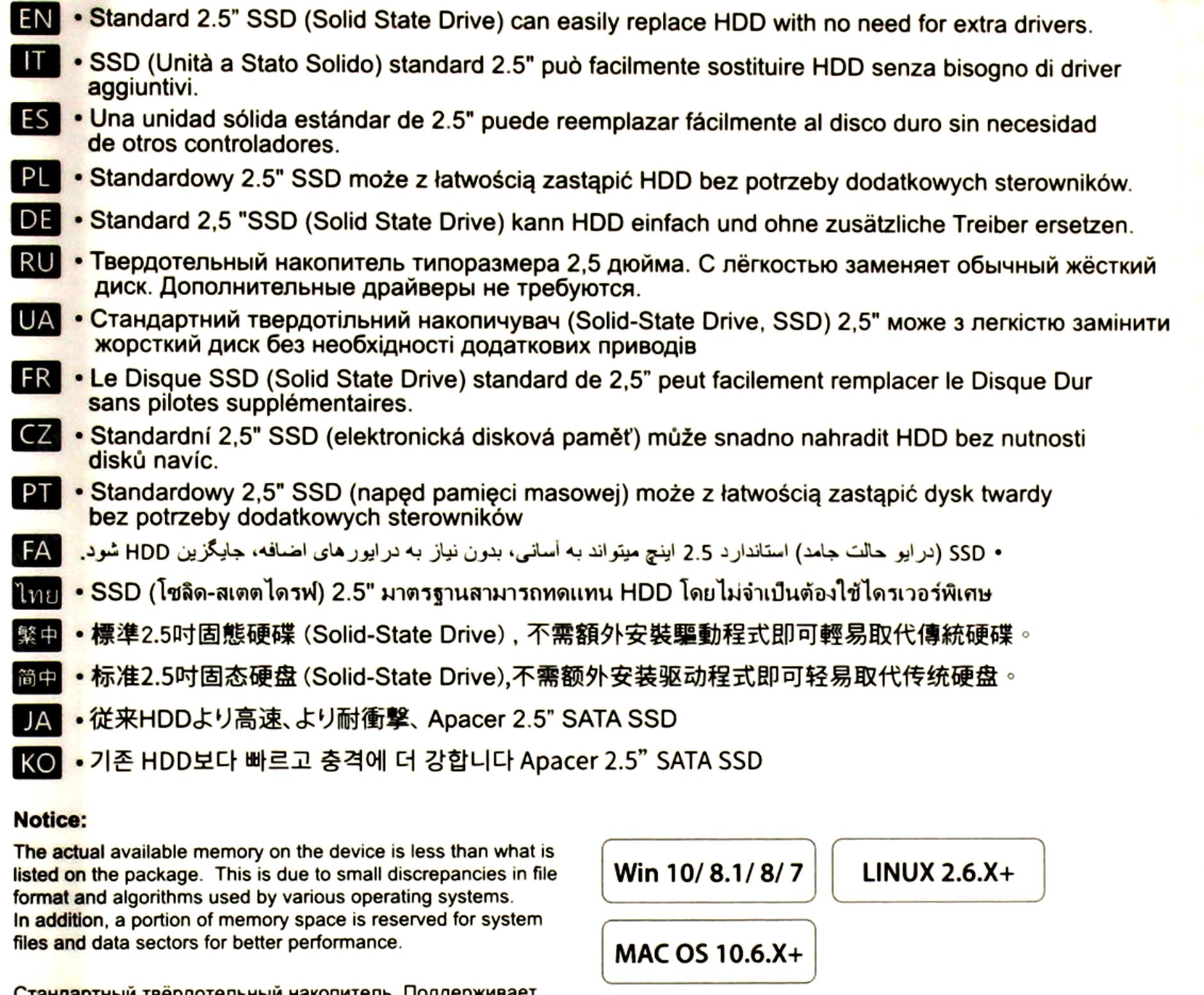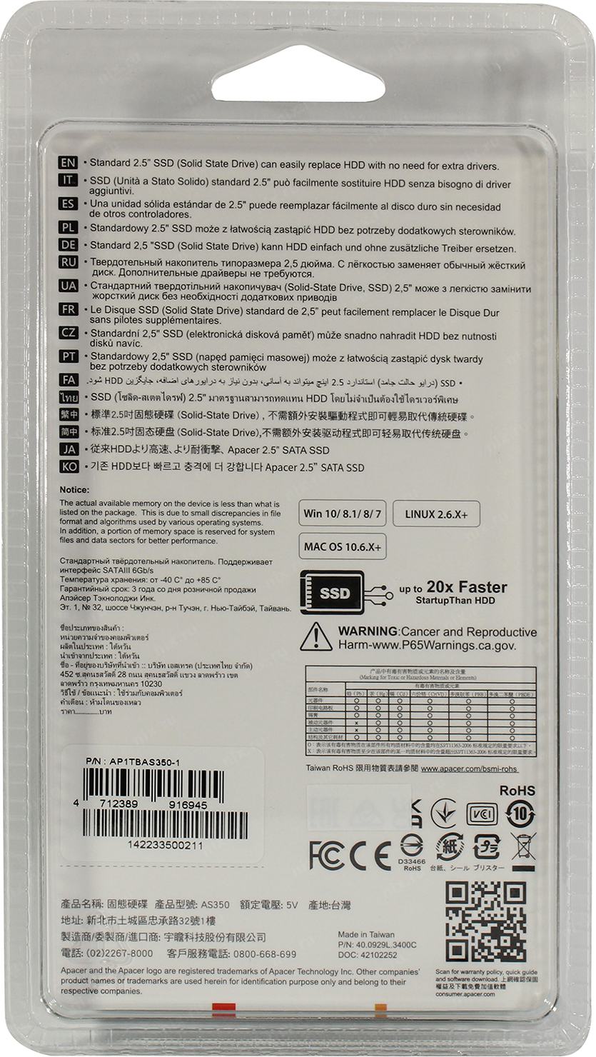 Твердотельный накопитель Apacer SSD PANTHER AS350 1TB SATA 2.5" 7mm, R560/W540 Mb/s, 3D TLC, IOPS 93K/80K, MTBF 1,5M, 600TBW, Retail, (AP1TBAS350-1)