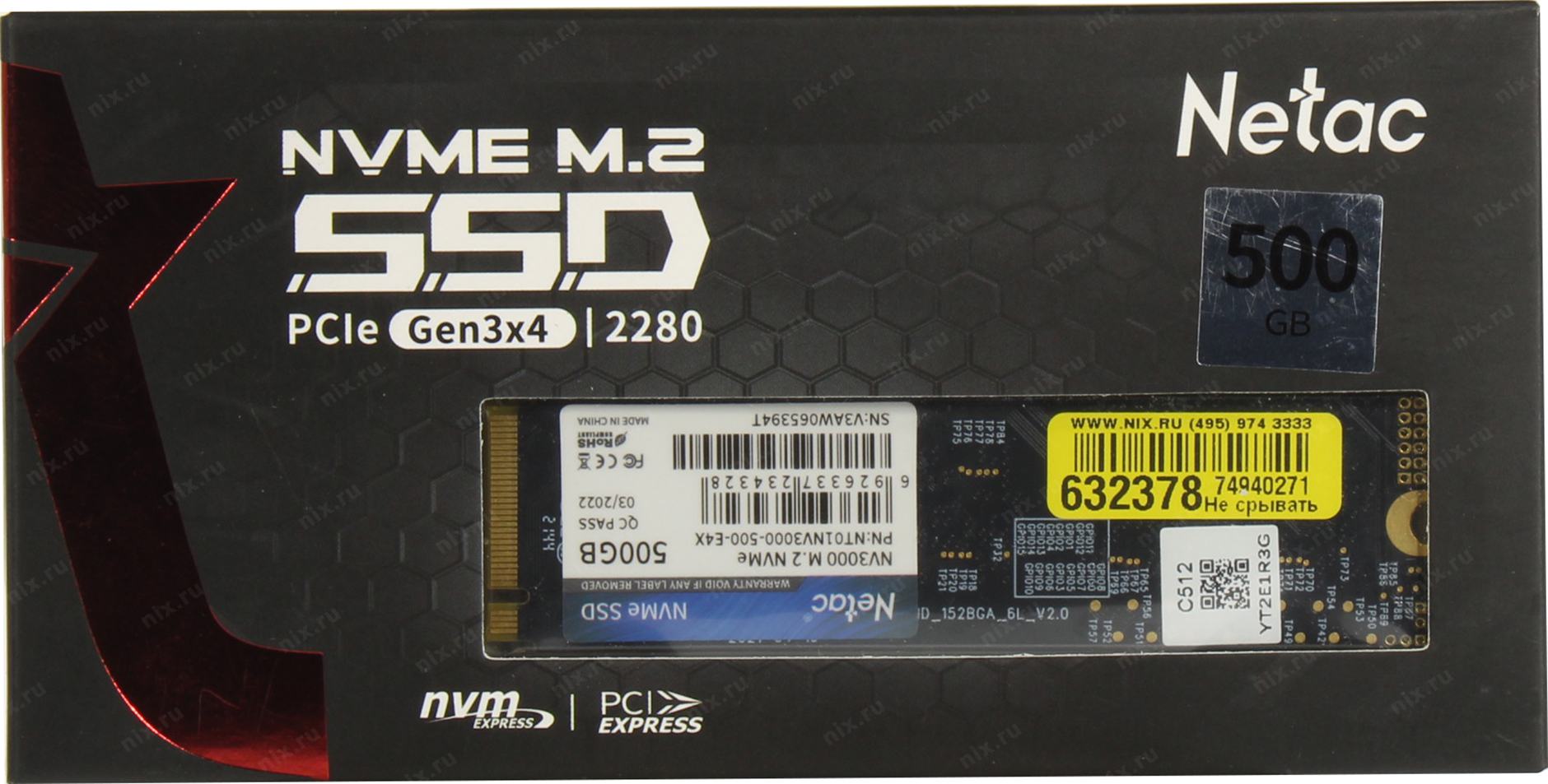 Накопитель SSD Netac PCIe 3.0 x4 500GB NT01NV3000-500-E4X NV3000 M.2 2280