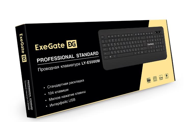 Клавиатуры Exegate EX296922RUS Клавиатура ExeGate Professional Standard LY-E5500M (USB, полноразмерная, влагозащищенная, 104кл., Enter большой, подставка под запястья, длина кабеля 1,35м, черная, Color Box)