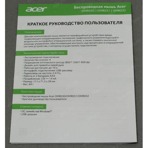 Мышь Acer OMR030 черный оптическая 1600dpi беспров. USB 4but (ZL.MCEEE.007)