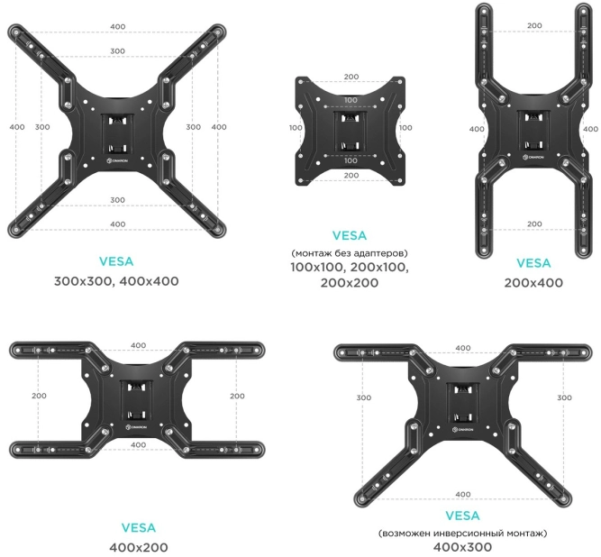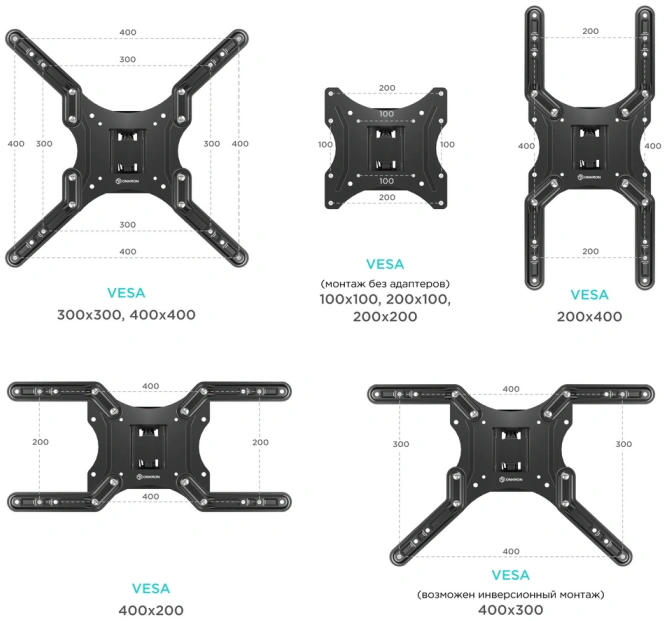 VESA 100 x 100, VESA 200 x 100, VESA 200 x 200, VESA 300 x 200, VESA 300 x 300, VESA 400 x 300, VESA 400 x 400