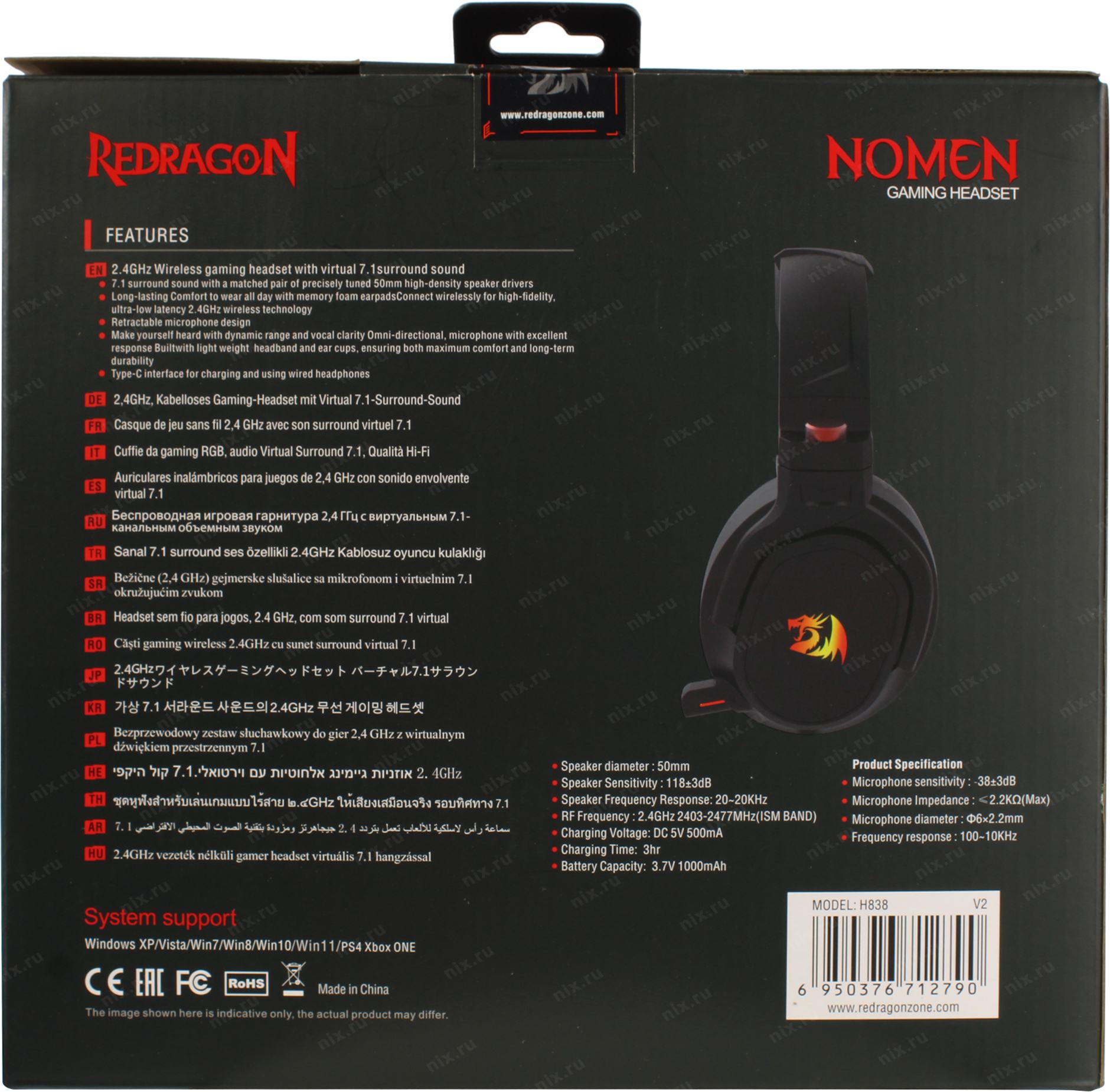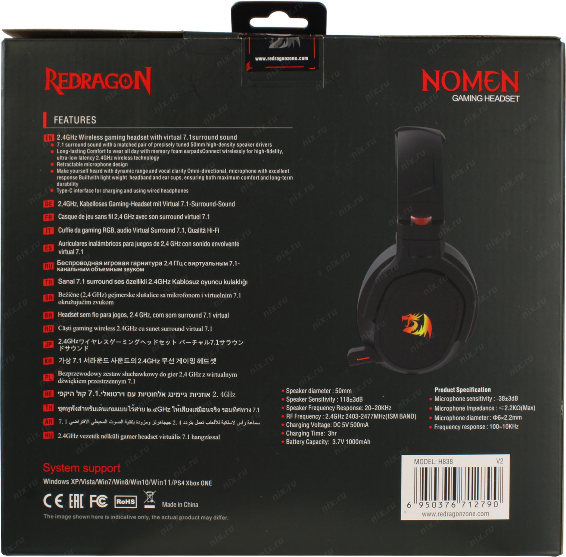 Наушники Defender Nomen RGB, 7.1, 2.4 Ггц, б.п. Redragon (71279)