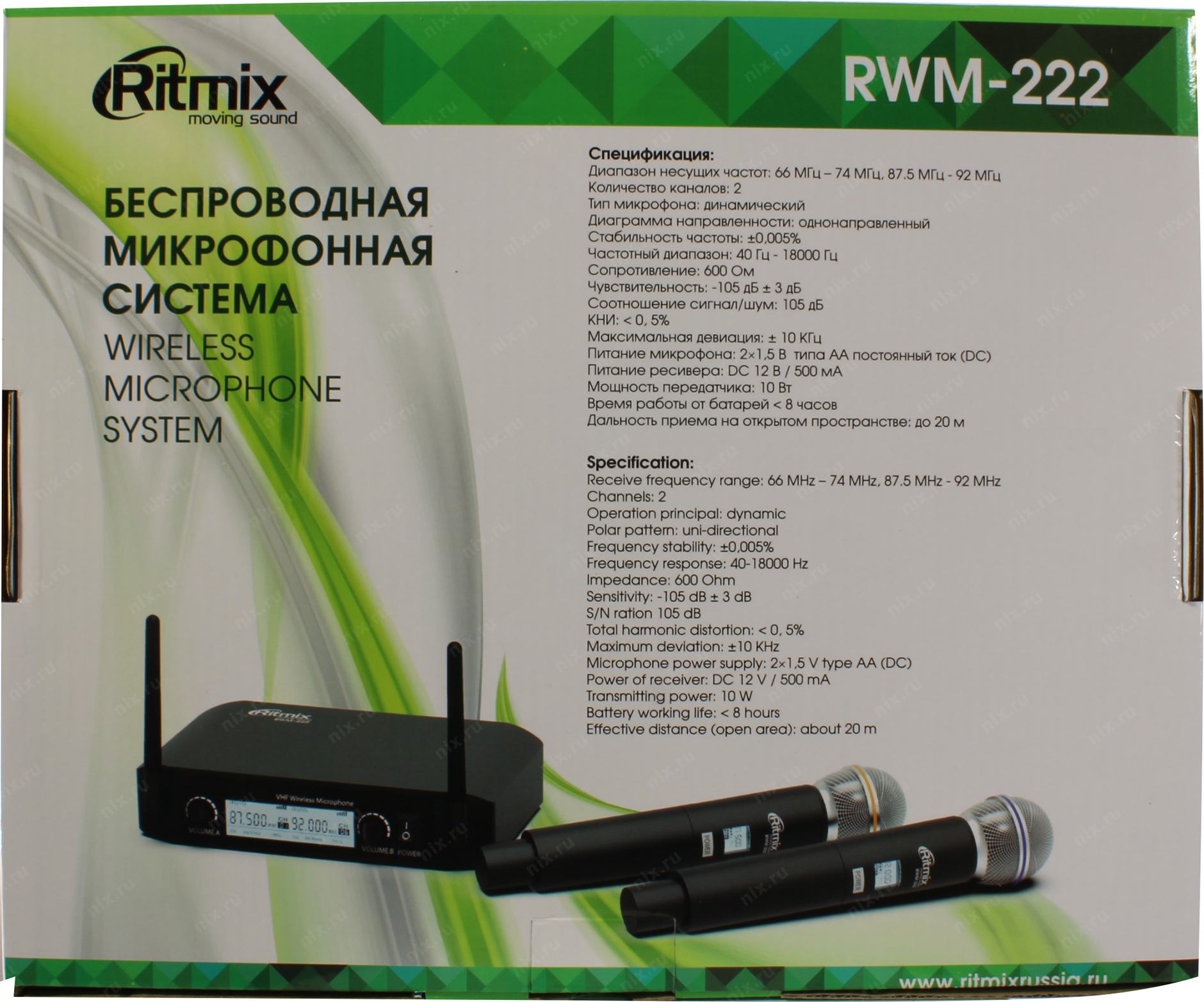 Наушники, микрофоны RITMIX RITMIX RWM-222 Black (2 микрофона: 66 МГц - 74 Мгц, 87.5 МГц - 92 МГц; раб. част.: 40 Гц - 18 000 Гц;чувств.: -105 дБ +/-3 дБ) [RWM-222Black]