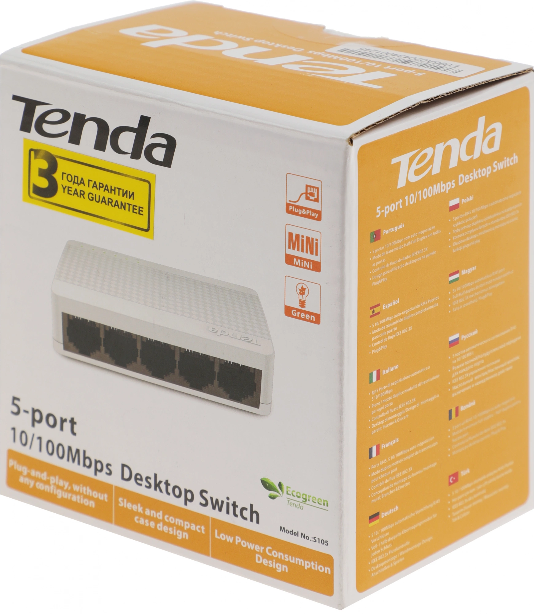 Tenda S105 - это энергоэффективное решение, которое не требует дополнительного охлаждения и работает практически бесшумно. Отсутствие вентиляторов делает его идеальным для использования в жилых помещениях и офисах, где важен низкий уровень шума. Коммутатор также поддерживает функцию автоматического согласования скорости (Auto-negotiation), что позволяет каждому порту независимо выбирать оптимальный режим работы (10 или 100 Мбит/с) в зависимости от возможностей подключенного устройства.