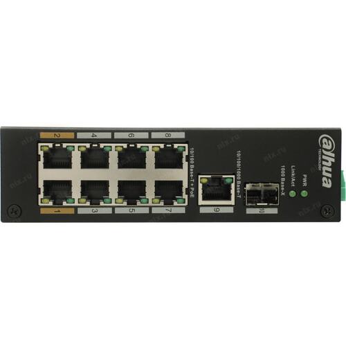 Коммутаторы DAHUA DH-PFS3110-8ET-96 8-портовый неуправляемый коммутатор с PoE, уличное исполнение, 8xRJ45 100Mb PoE, 1xRJ45 1Gb + 1xSFP 1Gb uplink, суммарно 96Вт, коммутация 7.6 Гбит/с, MAC-таблица 8К