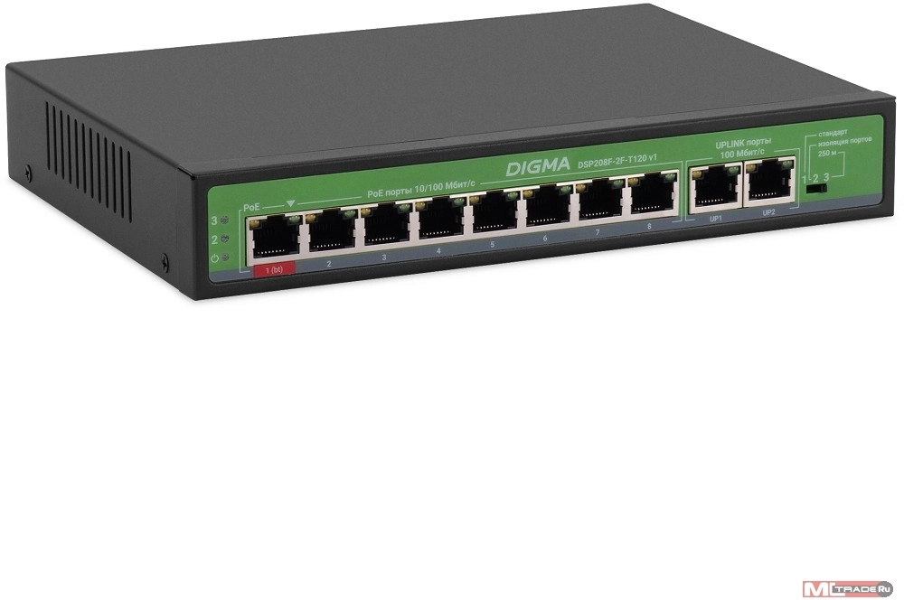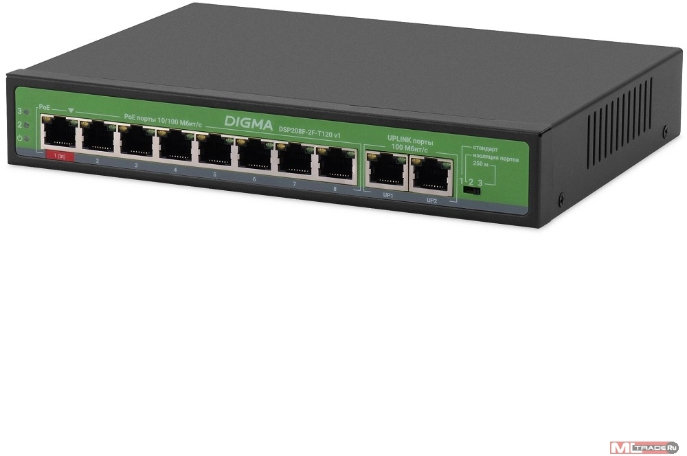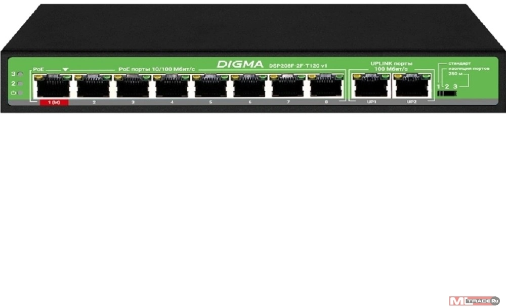 Коммутатор Digma DSP208F-2F-T120 DSP208F-2F-T120 V1 (L2) 10x100Мбит/с 8PoE 8PoE+ 120W неуправляемый