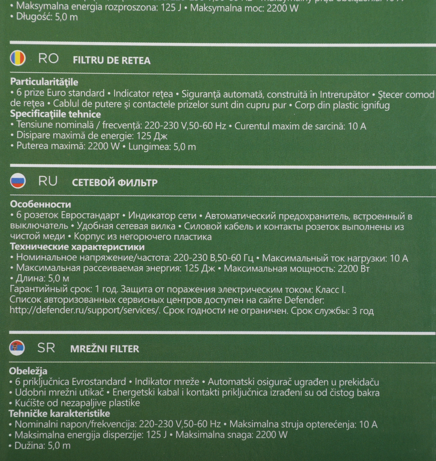 Сетевой фильтр 5M DFS 155 6OUTL. 99493 DEFENDER