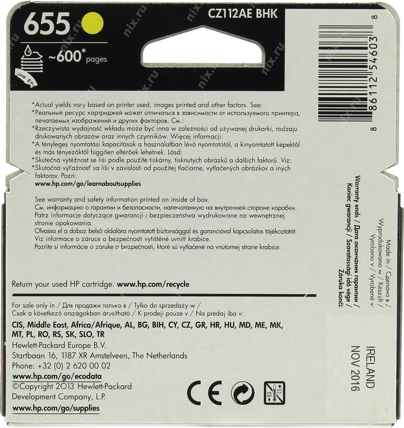Расходные материалы HP CZ112AE Картридж №655, Yellow (DeskJet IA 3525/5525/4615/4625, Yellow)