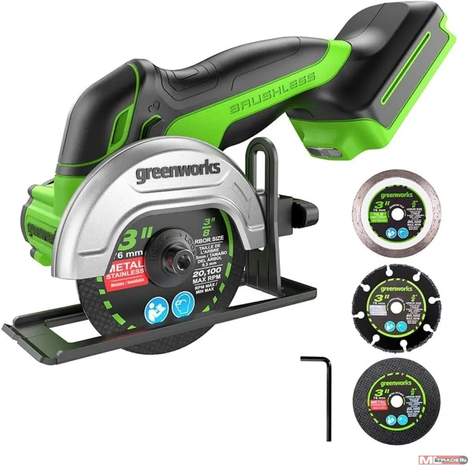 Углошлифовальная машина (мини-ушм) Greenworks GD24UCS; Опорная подошва + фиксатор; Шестигранный ключ; Опорный и зажимной фланец с зажимным винтом; Твердосплавный отрезной диск; Абразивный отрезной круг; Алмазный отрезной диск по плитке; Руководство по эксплуатации; Гарантийный талон.